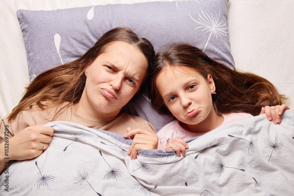A mother and her daughter lie together in bed, laughing and making silly faces. They are covered by a light blanket, enjoying a playful morning together at home