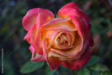 Close-up of yellow and pink flower of Rose Pullman Orient Express in the flowerbed on springtime