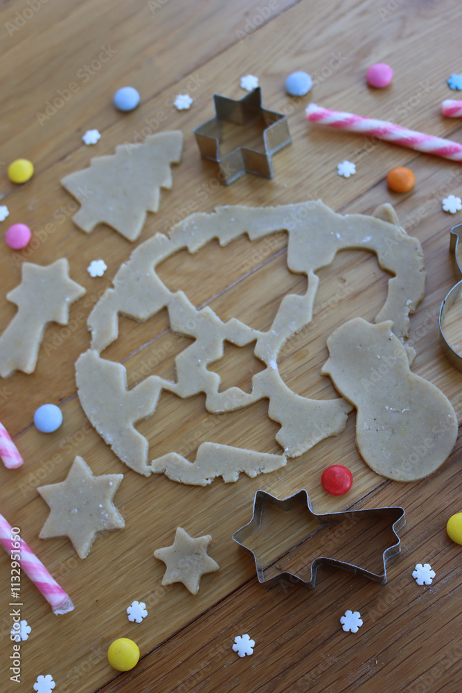 Gingerbread dough with cookie cutters and other Christmas decorations on wooden table