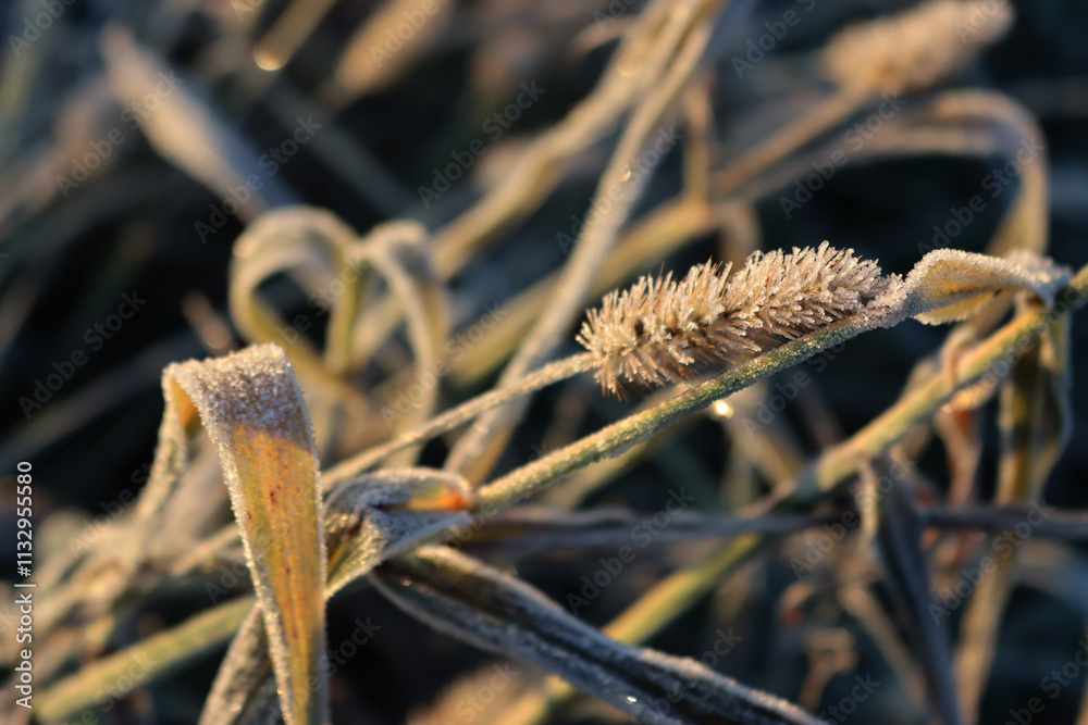 Close-up of Setaceum pennisetum or gramineae grass covered by frost in the meadow on winter season