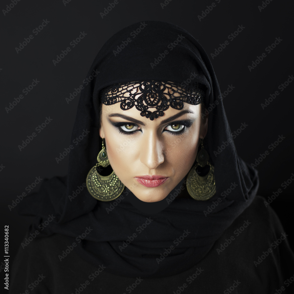 Beautiful Caucasian young woman with black fancy Arabian costume
