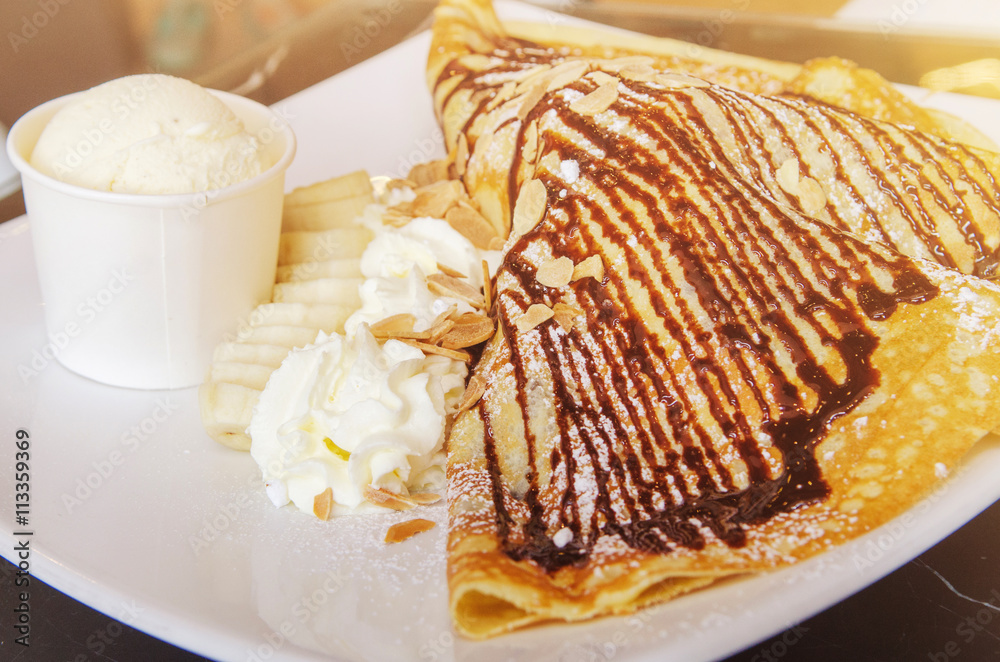 Close up chocolate crepe with banana and Vanilla ice cream.
