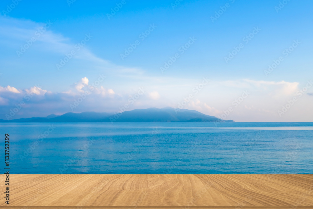 Wood floor counter top There is a view of the swimming pool and sea in the background of the resort. A blurry garden of trees is visible. of decorative design ideas