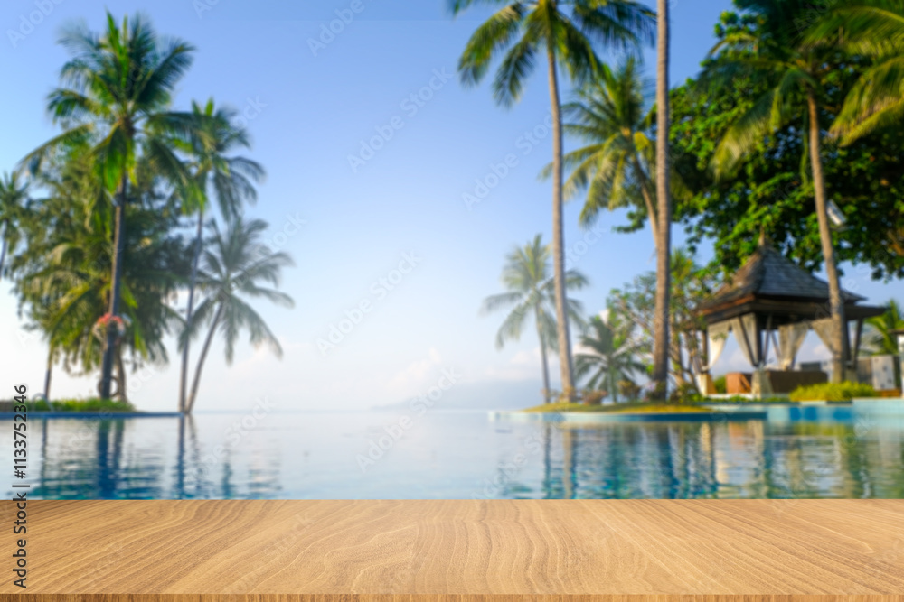 Wood floor counter top There is a view of the swimming pool and sea in the background of the resort. A blurry garden of trees is visible. of decorative design ideas