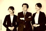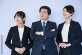 ビジネススーツで複数(3人)笑顔のイメージのカメラ目線 女性の活躍しそうな組織イメージ未来や目標を見上げる 水色背景
