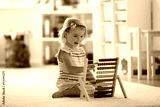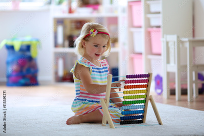 Preschooler girl learns to count. Cute child playing with abacus. Little girl having fun indoors at home, kindergarten or day care centre Educational concept for school kids.