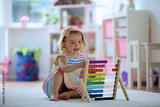 Preschooler girl learns to count. Cute child playing with abacus. Little girl having fun indoors at home, kindergarten or day care centre Educational concept for school kids.
