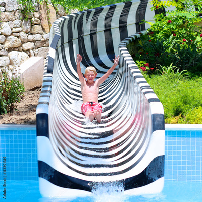 Happy child, blonde teenage boy having fun on water slide in a outdoors swimming pool on sunny day during summer vacation in a beautiful tropical resort