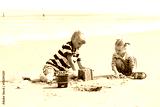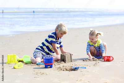 Two happy active children, teenage boy with his little sister, cute blonde toddler girl, playing with plastic toys building sand castles sitting on wide sandy North European beach