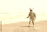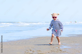 Cute active child wearing pink sunglasses playing and running on wide sandy beach. Happy little girl enjoying summer holidays on a sunny day. Family with young kids on vacation at the North Sea coast.