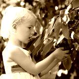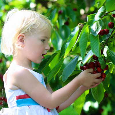 Child picking sweet cherries on a farm and eating bio fruit. Little girl playing in cherry tree garden in agricultural bio farm on sunny summer day. Kid picking healthy organic fruit.