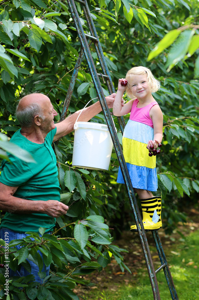 Grandfather and granddaughter picking red sweet cherries from tree in the garden. Family eating healthy organic fruits. Child enjoying summer vacation in the farm at countryside.