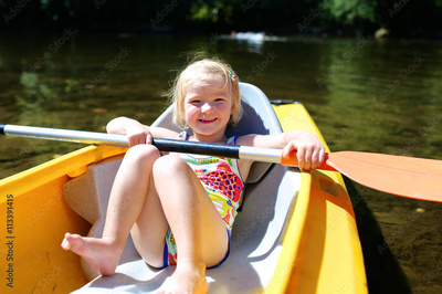 Family kayaking on the river on sunny summer day. Happy little child having fun enjoying adventurous experience. Water sport activities day during summer vacation