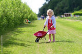 Young children walking with barrow wheel trolley in the farm. Small toddler girl harvesting healthy vegetables in the field. Healthy bio food concept.