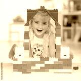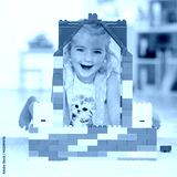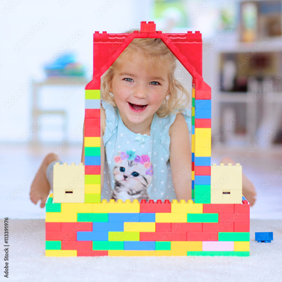 Little preschooler girl building house from plastic blocks. Lovely laughing child, blonde girl of preschool age playing with colorful bricks sitting on carpet in a sunny room at home or kindergarten