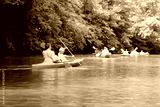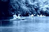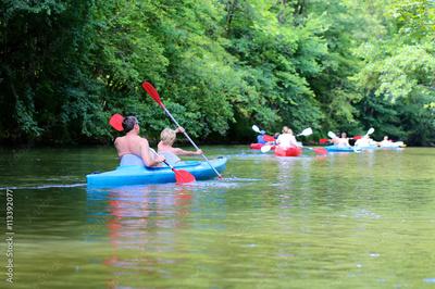 Father and son kayaking on the river. Active happy family, a man with teenage school boy, having fun together enjoying adventurous experience on a sunny day during summer vacation.