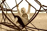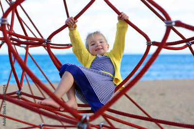 Little girl climbing in beach playground. Family with children enjoying vacation at the sea. Active kid having fun outdoors.