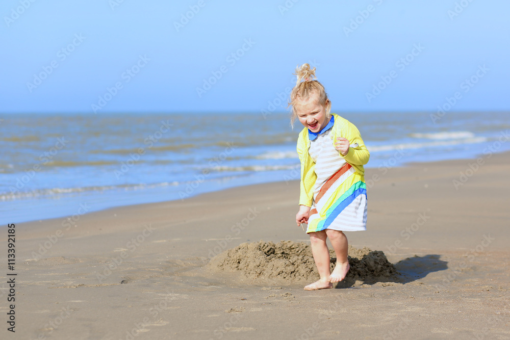 Cute active child wearing colorful dress playing on wide sandy beach. Happy little girl enjoying summer holidays on a sunny day. Family with young kids on vacation at the North Sea coast.