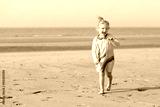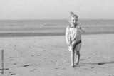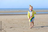 Cute active child wearing colorful dress playing on wide sandy beach. Happy little girl enjoying summer holidays on a sunny day. Family with young kids on vacation at the North Sea coast.