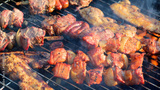 Assorted mixed grill on wooden skewers from chicken meat, lamb and pork, marinated spareribs, sausages and various vegetables roasting on barbecue grid cooked for summer family dinner