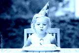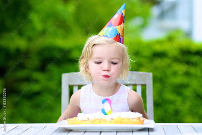Adorable birthday girl making wish blowing candles on the cake. 3 years old toddler kid celebrating and enjoying party outdoors on summer day.