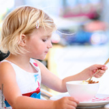 Little child eating ice-cream in cafe. Adorable blonde toddler girl enjoying delicious refreshing dessert on sunny summer day.
