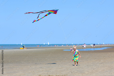 Cute toddler girl playing on the beach flying colorful kite. Child enjoying summer day at the north sea. Family vacation concept.