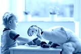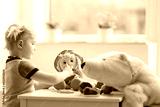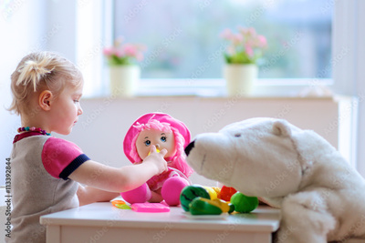 Adorable smiling child, blonde toddler girl, playing indoors at home or kindergarten, cutting plastic vegetables and feeding her toys, doll and teddy bear. Promoting healthy lifestyle for kids.