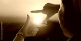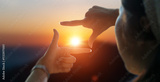 Close up of female hands making frame gesture view distant over sunset. Future planning idea concept.