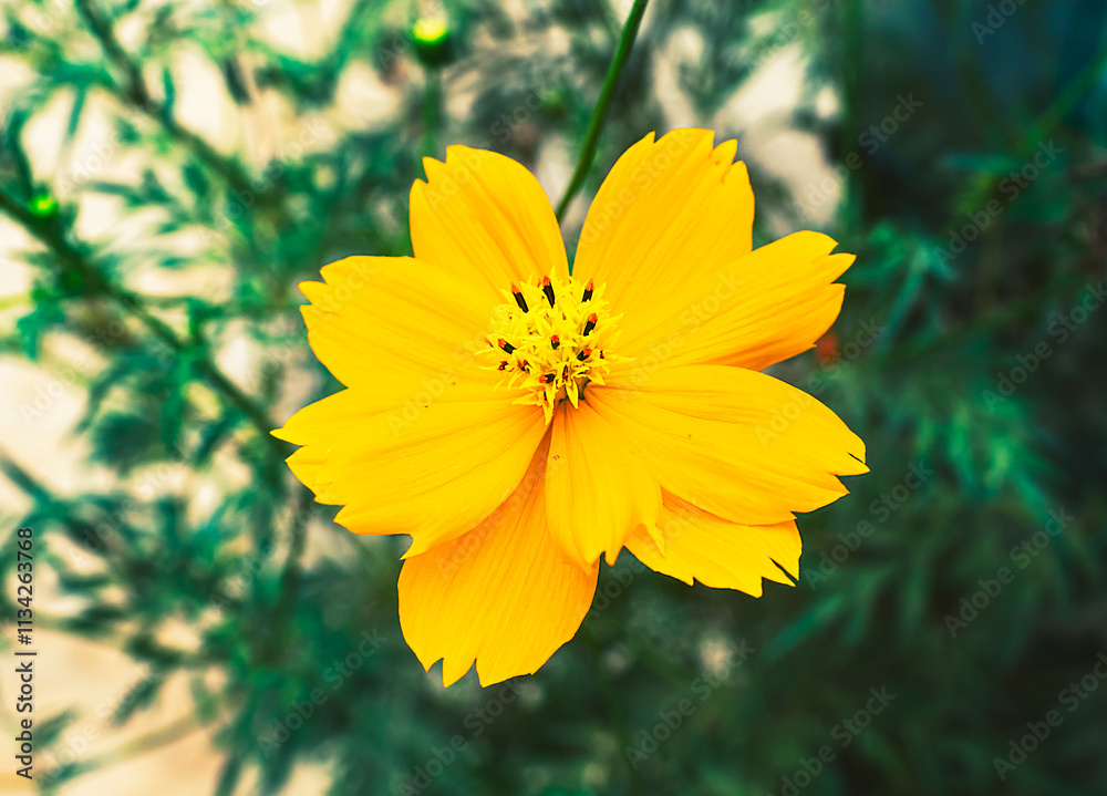 photo yellow flower of cosmos sulphur-yellow with large petals. Cosmos sulphur-yellow on the background of green leaves. postcard theme