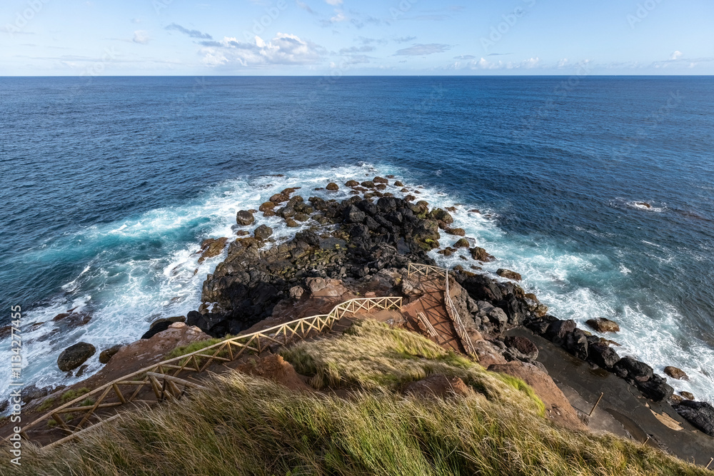 Breathtaking view of the wavy Atlantic ocean from the cliff in Azores islands Portugal