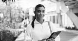 Portrait, college and woman with tablet, smile and student with scholarship, education and outdoor. Campus, proud and Indian person with knowledge, university and happy for opportunity in Mumbai