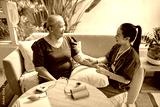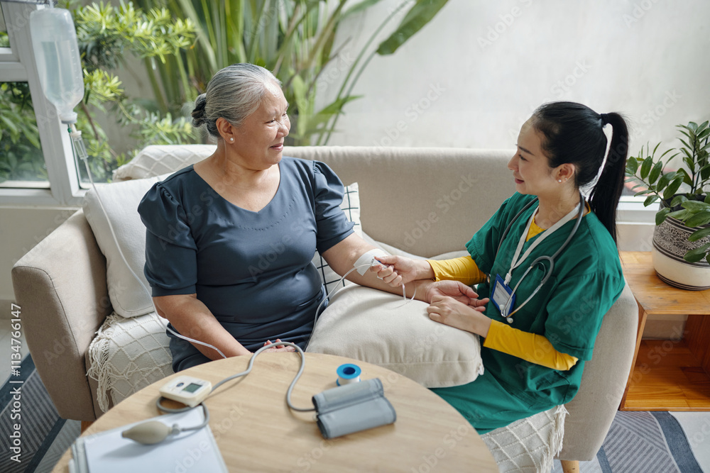 Caregiver making iv drip to senior patient at home
