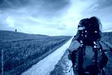 Tourist woman with backpack hiking in the mountains on field