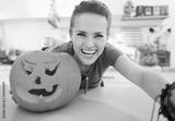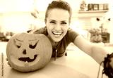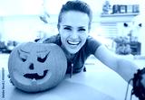 Smiling young woman taking selfie in halloween decorated kitchen