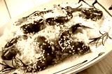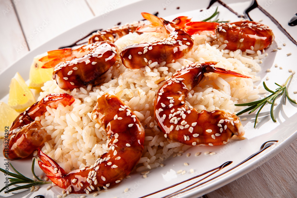 Fried shrimps with boiled white rice and sesame seeds on wooden table