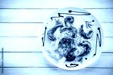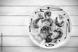 Fried shrimps with boiled white rice and sesame seeds on wooden table