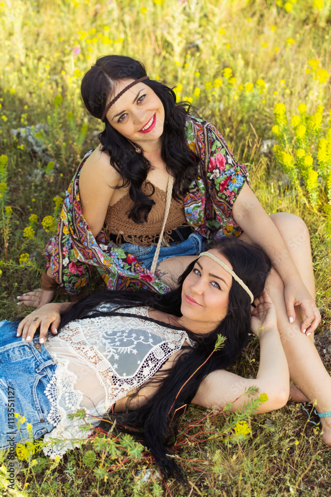 Two hippie boho sisters relaxing in nature in summer