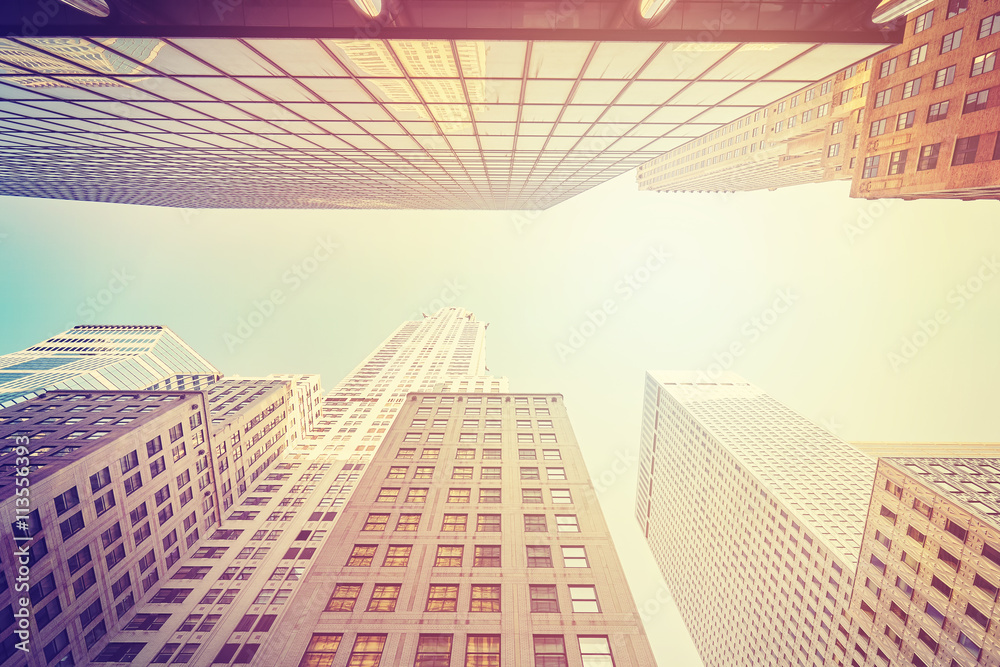 Vintage stylized photo of skyscrapers in Manhattan at sunset, New York City, USA.