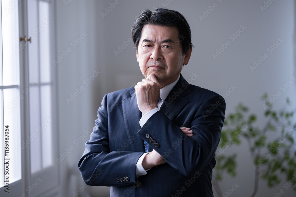 悩んで考えるシニアの経営者や社長の真剣、真面目でネガティブなイメージのカメラ目線