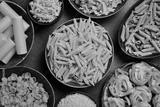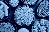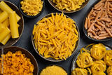 Pasta. Various kinds of uncooked pasta and noodles in bowls. Gluten free products. Set of pasta on kitchen background.
