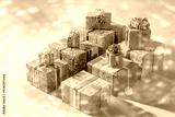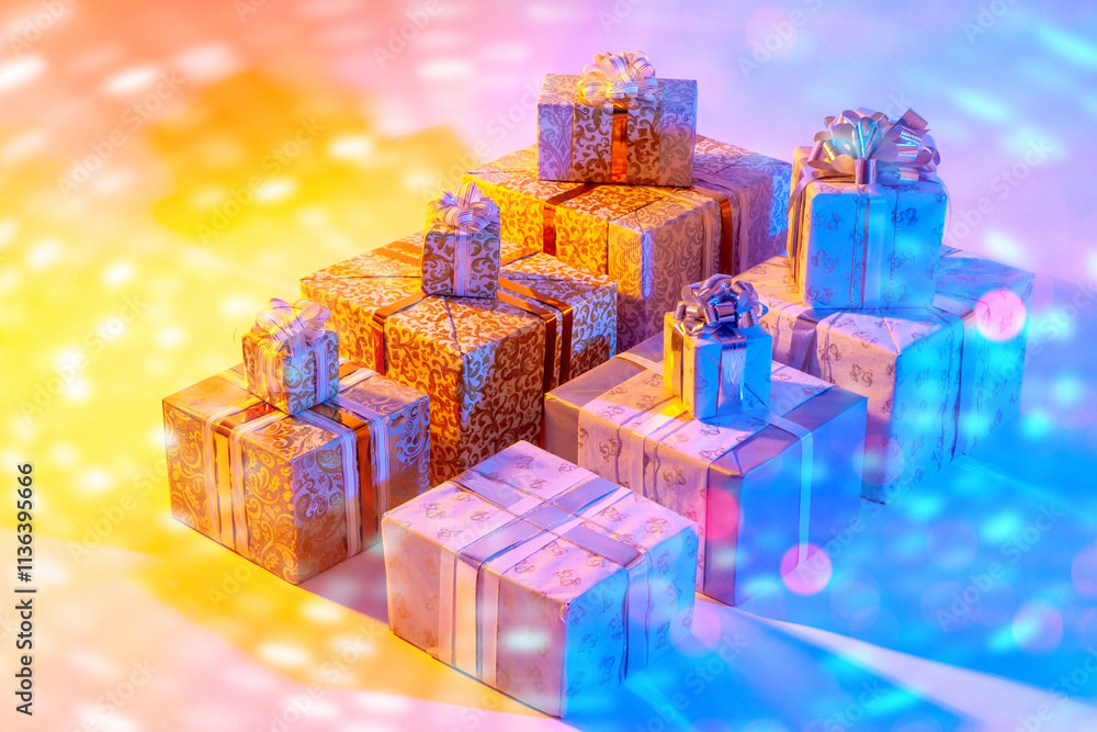 Gift boxes on table. Presents of different sizes. Christmas gifts with lush bows. Presents for birthday in rays of multi-colored light. Gift boxes for happy new year. Gifts wrapped with pattern