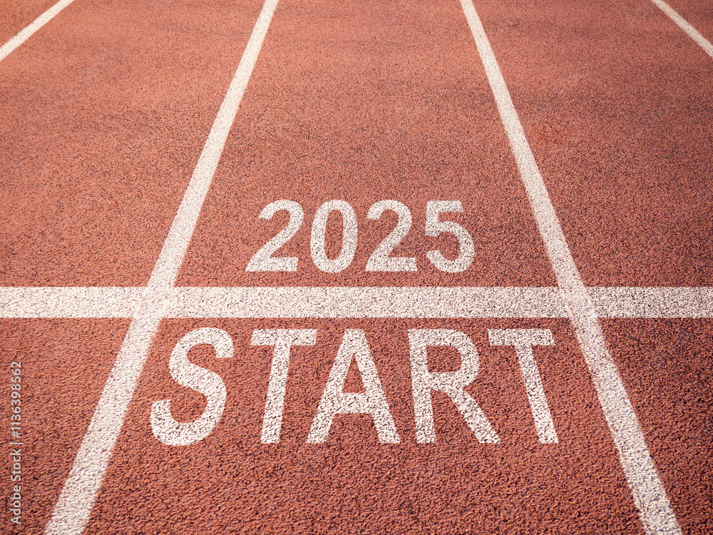 Inscription 2025 on stadium track. Word start at asphalt. Approaching 2025 on road. Beginning of new season. Coming of new year. Number 2025 is on road. Two thousand twenty five text.