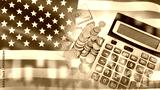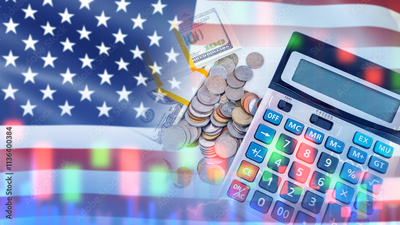 Business in USA. Calculator and money on table. Flag United States. Accounting in USA. Calculator for creating financial strategy. Business accounting America. Investments in US securities