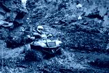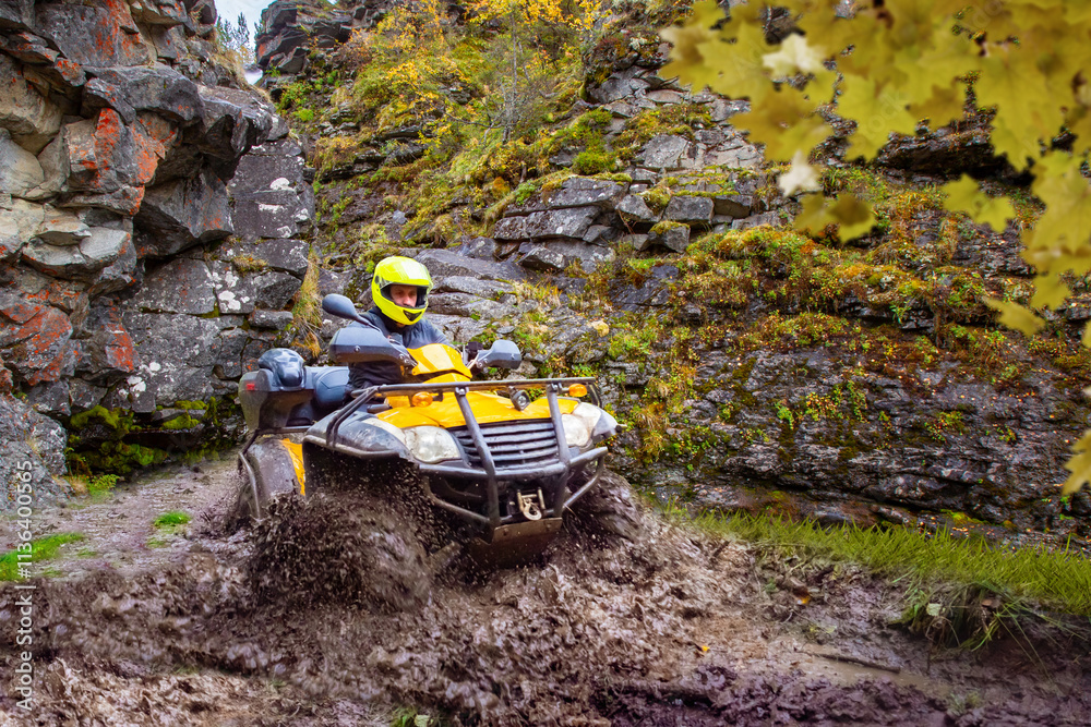 Riding ATV. Man on all-terrain vehicle rides through mud. Extreme use quad bike. Traveling on ATV in rainy weather. Extreme sportsman overcomes off-road conditions. Mountain yellow ATV