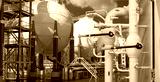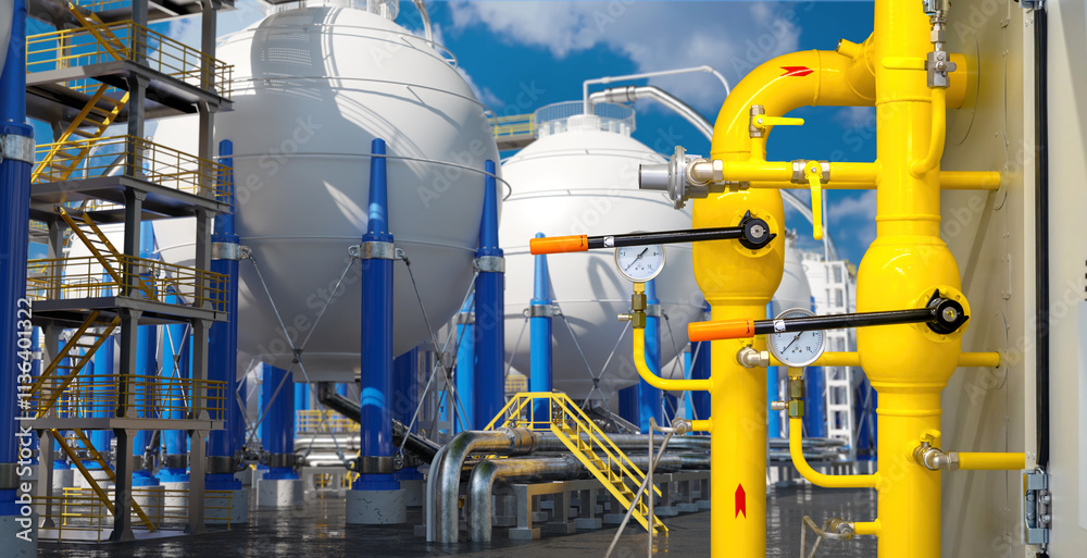 Gas power station. Factory with BPVC tanks. Energy factory under blue sky. Yellow pipes for supplying production with gas. Spherical high pressure tanks. Modern gas manufactory. 3d image