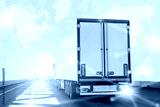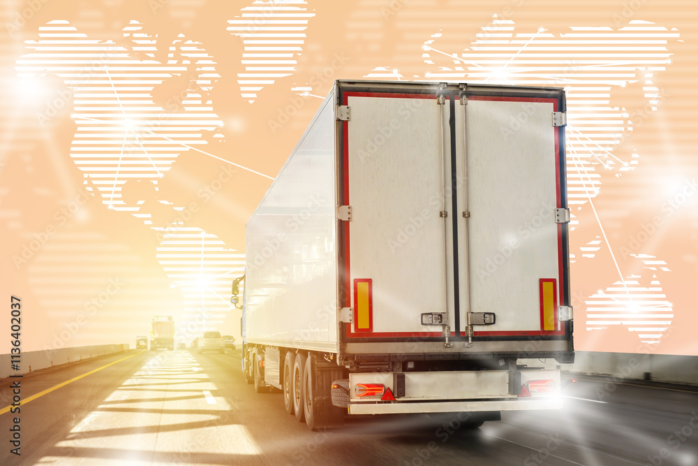 Truck is driving along road. Van for transporting goods. Shipment transport. Rear view of truck on highway. White van near world map. Truck from logistics company. Lorry for delivery