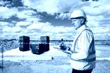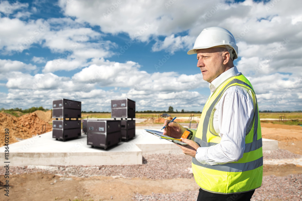 Man from construction company. Design engineer near foundation. Architect stands at construction site. Containers for transporting construction equipment behind worker. Man engineer architect