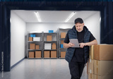 Man near self storage room. Guy at entrance to warehouse. Man rents storage room via tablet. Pantry with boxes on shelves. Self storage room behind owner. Warehouse property rental