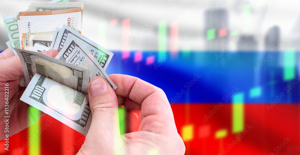 Business in Russia. Money in hands of man. Russian flag with investment charts. Growth quotes. Increasing number of investments in Russia. Economic growth concept. Investments in Russian federation